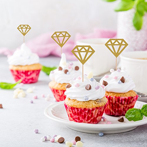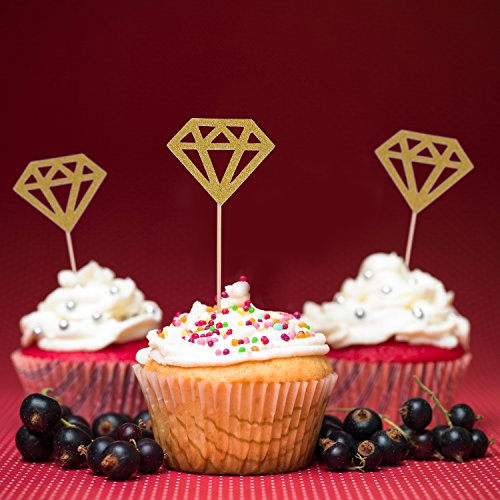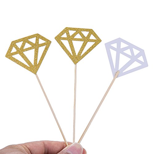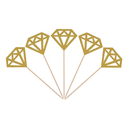 Mtlee 50 pack golden glitter diamond cakes toppers 50 Pack glitter diamond cupcake toppers: Comes with bamboo toothpicks, easy to put the toppers on your cakes; With shiny golden front which makes the toppers look lively and add glitter color to the cakes. Good quality material: There glitter cupcake toppers are made up of good quality paper and natural bamboo toothpicks, easy to use and make your cupcakes look as yummy as they taste. Application: Good decorations for birthday party, wedding, engagement, baby shower or anniversary and more, suitable as cake decoration. Specifications: Material: paper, bamboo Totally length: 13.5 cm/ 5.31 inch (including the stick) Diamond width: 5 cm/ 2.0 inch Diamond length: 4.1 cm/ 1.6 inch Color: golden front, white back Weight: 30 g Package includes: 50 x Golden glitter diamond cakes toppers Note: Cupcake toppers are for decoration purposes only, please do not place in oven. 0