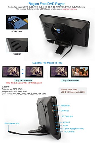 - Feature : Updated 10.1" HD 1024*600 touch screen: support 1080P videos, support AVI 1920*1080, AVI 1440*1080, MP4 1920*1080, MP4 1440*1080, etc / Perfect fusion: Ultra-thin and elegant design, comes with 2 brackets of different size and 2 FREE plastic frames--Piano Black and Silver for the headrest! Rounded design: protect children from being hit by the edges and corners of the DVD player when the car suddenly brakes. Removable Design: you can carry and use it both in car and at home / This headrest DVD player can work as a monitor when connect to your Raspberry Pi via HDMI port, enjoy the big surprise! / Built-in 2.0 USB port/SD/MMC card slot/IR/FM/Speaker/HDMI Input Port, and Built-in 32 bits wireless games Function, with Game Disc / Delivery via DHL (FBA orders not included). Expected to you within 4-9 days, and we offer 18-months warranty of replacing with defected parts (shipping charges not included)