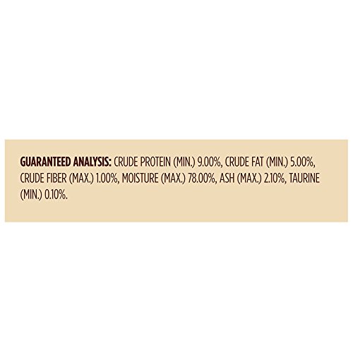 Guaranteed AnalysisCrude Protein (min) 9.0% Crude Fat (min) 5% Crude Fiber (max) 1.0% Moisture (max) 78% Ash (max) 2.10% Taruine (min) 0.10%