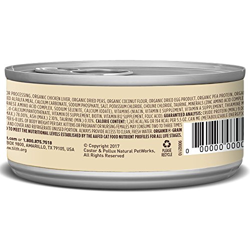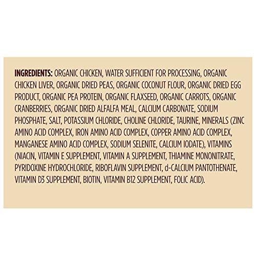 IngredientsOrganic Chicken, Water Sufficient for Processing, Organic Chicken Liver, Organic Dried Peas, Organic Coconut Flour, Organic Dried Egg Product, Organic Pea Protein, Organic Flaxseed, Organic Carrots, Organic Cranberries, Organic Dried Alfalfa Meal, Calcium Carbonate, Sodium Phosphate, Salt, Potassium Chloride, Choline Chloride, Taurine, Minerals (Zinc Amino Acid Complex, Iron Amino Acid Complex, Copper Amino Acid Complex, Manganese Amino Acid Complex, Sodium Selenite, Calcium Iodate), Vitamins (Niacin, Vitamin E Supplement, Vitamin A Supplement, Thiamine Mononitrate, Pyridoxine Hydrochloride, Riboflavin Supplement, d-Calcium Pantothenate, Vitamin D3 Supplement, Biotin, Vitamin B12 Supplement, Folic Acid).