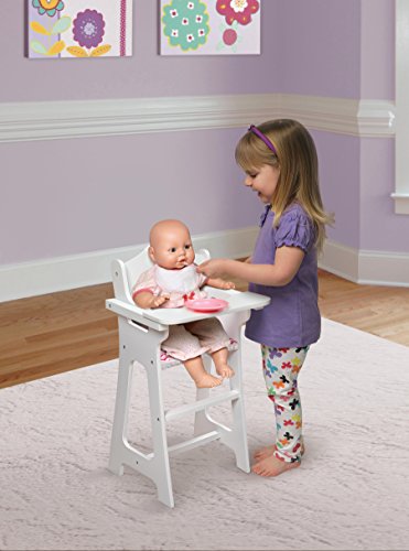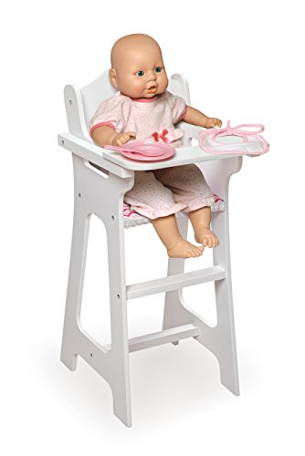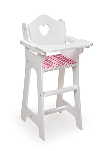 Badger Basket's Doll High Chair with Plate, Bib, and Spoon is a special spot for feeding your baby doll with engaging details and fun feeding accessories. Also makes a nice seat to display a treasured collector doll. Doll-size plate, bib, and feeding spoon keep your child engaged in social role-play. Fabric seat cover. High chair tray lifts and lowers. Tray can be flipped fully around to the back of the chair so it’s out of the way. The flat tray surface is perfect for perching everything dolly needs at meal time. Sturdy chair has a scalloped seat back with a charming heart cutout. Footrest below the seat is another realistic touch. High chair is made with wood and durable engineered wood. Seat cover is 100% Polyester fabric. For dolls up to 18 inches. Fits 18 inch dolls such as American Girl, My Life As, Madame Alexander, and Our Generation; and also fits 15 inch American Girl Bitty Baby dolls and 14.5 inch American Girl WellieWishers dolls. Overall high chair measures 10.5 inches W x 12.5 inches L x 24 inches H. Wipe the frame clean with a damp cloth and mild soap and dry thoroughly. Spot clean or hand wash the removable fabric as needed with cold water and mild detergent and air dry. Adult assembly required. Illustrated instructions included. For children from three years old and up. This item is to be used with dolls only and is never to be used with real infants or pets. /! WARNING: CHOKING HAZARD - Small parts. Not for children under 3 yrs. Product complies with all currently applicable safety standards. Product includes a limited warranty of 30 Days Parts to the original purchaser. Doll and doll clothes/accessories not included. Product may vary slightly from shown and described. Props/accessories shown are for illustration purposes only and are not included with the product. Actual color/finish may vary slightly from screen display. This item ships in its original carton which may include a product photo.Feature