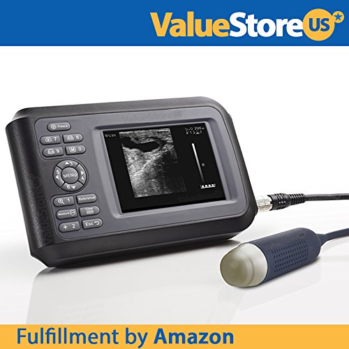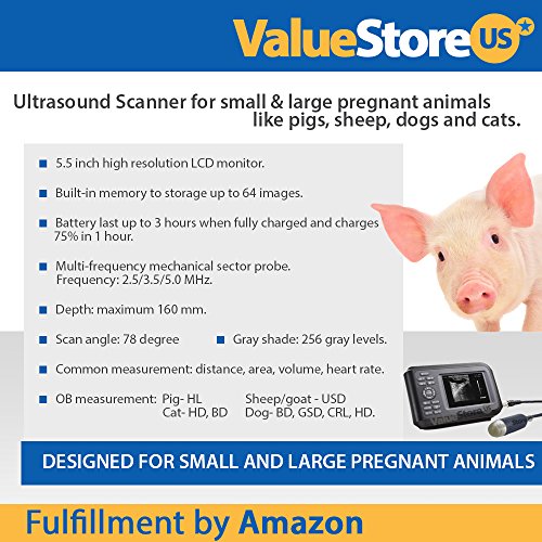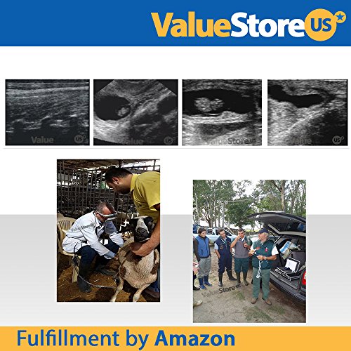 Studio : ValueStore.us Publisher : ValueStore.us Binding : Health and Beauty Product Description PORTABLE ULTRASOUND VETERINARY SCANNER FOR SMALL LARGE ANIMALS: - Ultrasound scanner for small large pregnant animals like pigs, sheep, dogs and cats. - 5.5 inch high resolution LCD monitor and built-in AV port to view in real-time images on your TV or monitor of up to 42 inch (Plug Play). - Multi-frequency convex probe. Frequency: 2.5/3.5/5.0 MHz. - Built-in memory can storage up to 128 images. - Depth: maximum 160 mm. - Common measurement: distance, area, volume, heart rate. - Scan angle: 78 degree and gray shade: 256 gray levels. - OB measurement: Pig- HL ; Sheep/goat - USD ; Bovine- BL, SL, HL ; Cat- HD, BD ; Dog- BD,GSD, CRL, HD. Portable Ultrasound Veterinary Scanner for Small Large Animals YOUR VETERINARY SCANNER INCLUDE: (1x) 5.5 inch ultrasound scanner monitor and built-in AV port to view in real-time images on your TV or monitor of up to 42 inch (Plug Play). (1x) 3.5 MHz multi-frequency convex probe. (1x) Rechargeable Li-lon battery. (1x) AC adapter (110-220 volts, 50/60 Hz). (1x) Belt for shoulder. (1x) Rubber protector for the main unit.