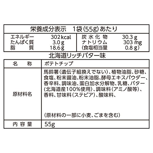 원재료:감자(유전자조 교환이 아니다)고, 식물성 기름지,설탕,식염,분말 간장,분말 유지,효모 엑기스 파우더,향신료,조미유,단백 가수분해물,유당,버터(홋카이도산100%사용)고, 조미료(아미노산등)고, 향료,감미료(스테 비어)고, 신맛료,(원재료의 일부에 밀,참깨를 포함한다)