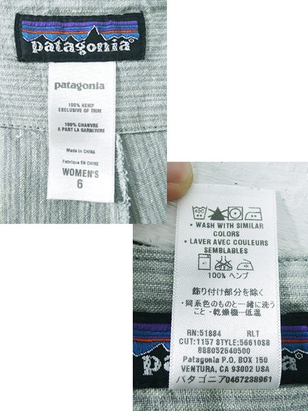 Ladies ブランドPatagonia パタゴニア カラーライトグレー メール便不可 コンディション★★★ 素材ヘンプ 表記サイズ6 スタッフコメント後ろ、左ひざ付近にヨゴレあり。 実寸サイズ 着丈 82 cm ウエスト 78cm 〜 70cm (31インチ〜27.5インチ) レングス(股下) 26 インチ(66 cm) 股上 23 cm 太もも幅 28 cm 裾幅 33 cm ※ウエスト・ヒップ以外は平置き採寸