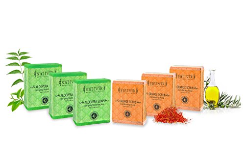 Sattvik Organics Bath & Body Kit : With Aloe Vera Soap (Pack of 3) & Gentle Moisturizing Soap & Orange Scrub Soap (Pack of 3) : Exfoliating Soap...