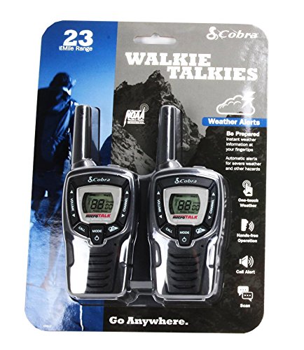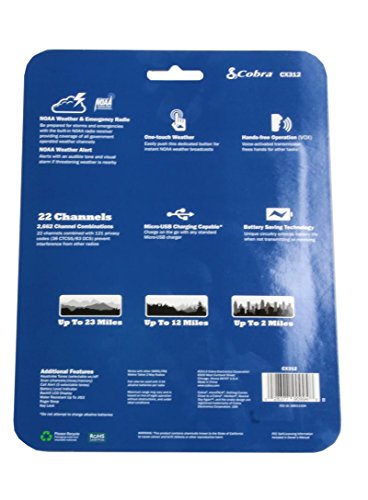 -. Binding : Electronics -. Brand : Cobra -. EAN : 0845876521583 -. Feature : 2,662 Channel Combinations - available when 22 channels are combined with the 121 privacy codes (38 CTCSS/83 DCS) / Up to 23 Mile Range - Extended range capability provides up to 23 miles range (Range will vary depending on terrain and conditions) / VOX Hands-Free Operation allows you to multi-task / 10 NOAA Weather Channels - be prepared for storms and emergencies with the built-in radio receiver providing coverage of all government operated weather channels / Weather Resistant - helps keep out moisture -. Label : Cobra -. Manufacturer : Cobra -. MPN : 2 x CX312 -. PackageQuantity : 1 -. PartNumber : 2 x CX312 -. ProductGroup : Car Audio or Theater -. ProductTypeName : TWO_WAY_RADIO -. Publisher : Cobra -. Studio : Cobra -. Title : (4) COBRA CX312 23 Mile 22 Channel FRS/GMRS Walkie Talkie 2-Way Radios w/ VOX -. UPC : 845876521583