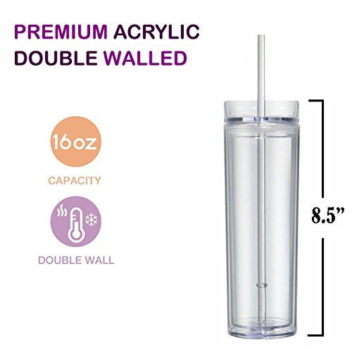 Set of 4 Clear Skinny Tumblers, matching snap on lids and clear plastic straws. Double wall acrylic construction, bpa free.