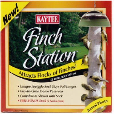 Studio : Kaytee Publisher : Kaytee Binding : Lawn Patio Product Description Kaycee Finch Station Makes attracting and feeding easier than ever. Finches adore soft mesh socks and prefer them over traditional tube feeders. The unique, Squiggle Sock design provides more surface area that enables finches to perch wherever they want, and allows for numerous birds to eat at one time. Finches easily extract seeds through the soft mesh of the sock, making the KAYTEE Finch Station their favorite place to eat. Enjoy more bird watching opportunities with fewer refills thanks to the weather-resistant dome reservoir which holds extra seed, automatically keeping the sock filled longer. Each KAYTEE Finch Station comes with one sock for initial use and one for replacement. 0