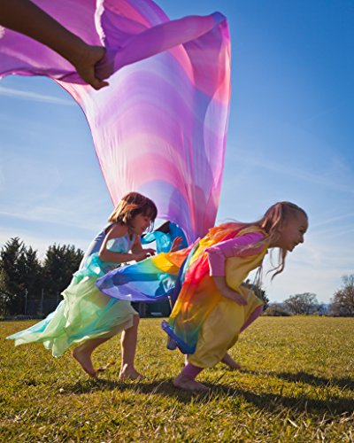 Playsilks, in the hands of children, are truly a bottomless toy chest. There are so many things that children will create with them. When playing dress-up, they will use playsilks to become pirates in one moment and birds in flight in another. Their size and texture make it easy for small hands to fold and tie. Their colors can inspire play using them as grass, sky, and water.Feature