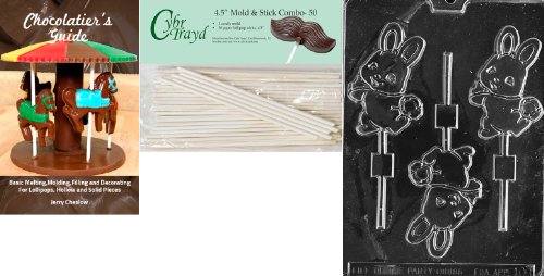 Cybrtrayd 'Cute Bunny with Basket Lolly' Easter Chocolate Candy Mold with 50 4.5-Inch Lollipop Sticks and Chocolatier's Guide