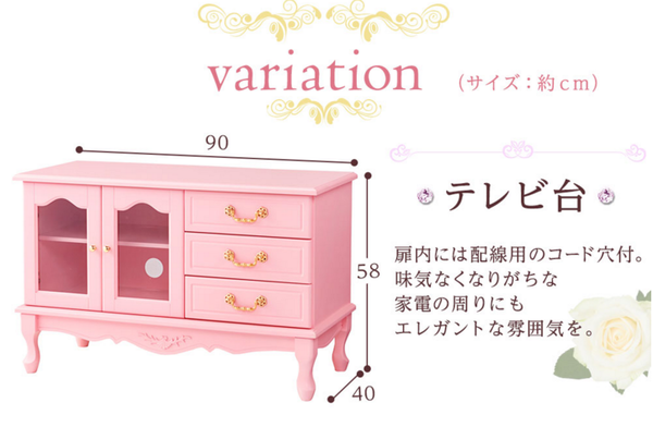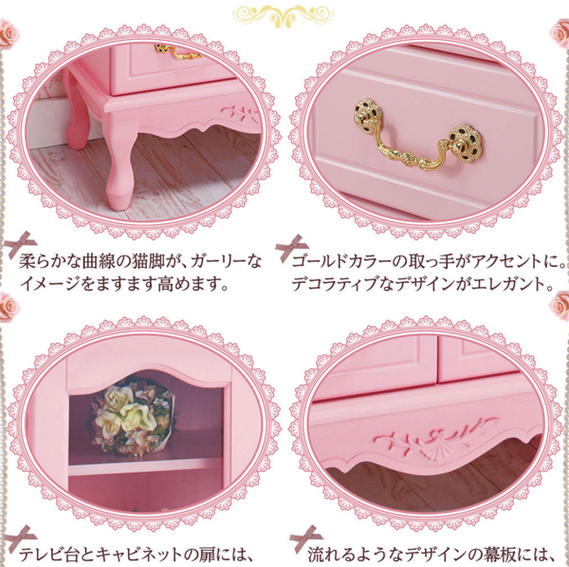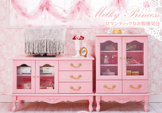 柔らかく上品なミルキーピンク家具。猫脚やガラス窓など細部にまで、プリンセスなこだわり。