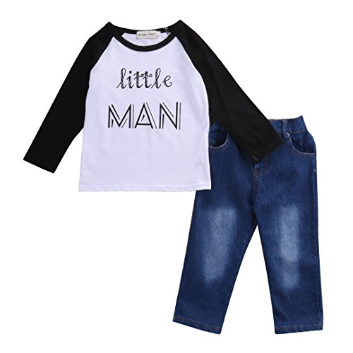 -. Binding : Apparel -. Brand : Guogo -. Color : As the Pictures -. Department : boys -. Feature : Material: Cotton Blend / Style: Specially design for the little man baby kids / It's a best gift for your cute baby boy, grandson, nephew... / Our tag sizes are Asian sizes, Please check your size with our SIZE CHART before you buy it. / Package content: 1*T-shirt+Leggings -. ProductGroup : Apparel -. ProductTypeName : PANTS -. Title : Newborn Kids Boys Little MAN T-shirt Tops+Denim Pants Jeans 2Pcs Outfits Set Clothes