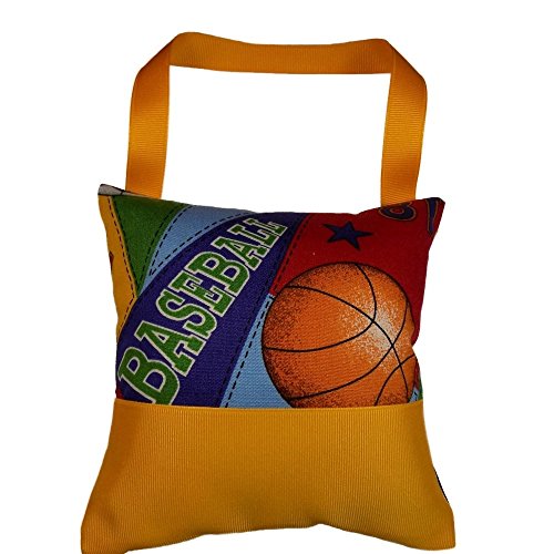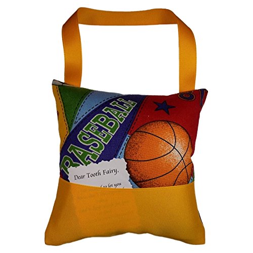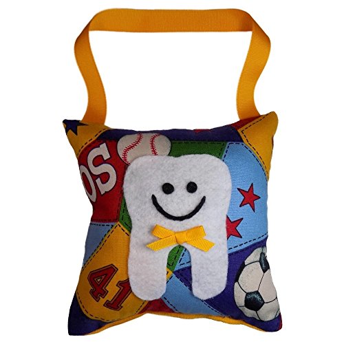 Studio : Trine Inc. Publisher : Trine Inc. Binding : Baby Product Product Description The Tooth Fairy Pillow keepsake from Trine, Inc. is handmade in America at our Jim Thorpe, Pennsylvania studio. It is made from cotton fabric, felt, yarn, grosgrain ribbon, and stuffed with polyester filling. The pillow measures approximately 6" X 6" (without the ribbon handle), and is made from a cotton fabric with an all sports design print . The front of the pillow has a white felt tooth and the back of the pillow has a small pocket that doubles as both a place to hold the lost tooth and a gift from the tooth fairy. The pillow has a grosgrain ribbon loop hanger so it can be hung from a bedpost or the knob of a door, closet, or dresser drawer. BONUS: Includes an original written little note card to the tooth fairy. Since each pillow is individually handcrafted there might be a slight variation from the pictured item. For example - the pattern in the fabric might be cut at a different spot, the embellishments might be placed slightly different on the pillow, or the colors may vary slightly because of picture lighting or different computer monitors. The pillow is for decorative purposes only, for best results spot clean. Recommended for ages 3 to 10. 0