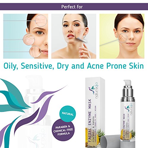 ALOE VERA. Nutrient-rich aloe allows our natural face mask to soothe and calm the skin to alleviate facial redness and other signs of irritation. PAPAIN & BROMELAIN. Enzymes from the papaya and pineapple plants give our youth skin care formula exfoliating properties to brighten skin and act as a wrinkle treatment. POMEGRANATE SEED OIL. Antioxidant-rich fruit extract provides anti aging benefits, protecting skin from wrinkle-causing oxidation damage. VEGETABLE GLYCERIN & COCONUT OIL. These natural moisturizers give our facial product softening, smoothing properties. WITCH HAZEL. This astringent tightens the pores and prevents breakouts. VITAMIN E. This natural nutrient conditions skin, assists with tissue repair, fights inflammation and provides antioxidant protection. Suitable for all types of complexions, our face mask promotes healthier, more attractive skin by: • Removing cellular debris to act as a brightening facial maskFeature