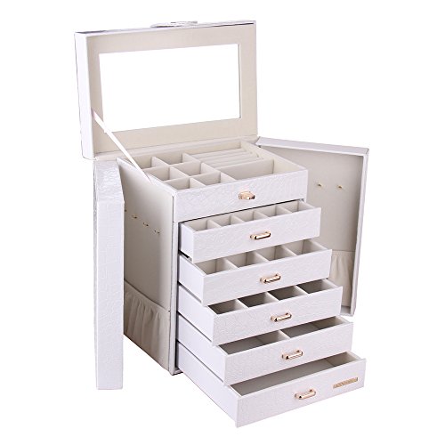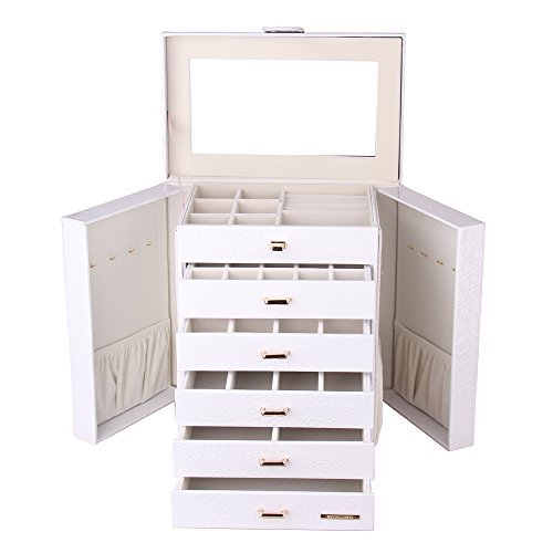 -. Feature : Size: approx. 30*20.4*32.8 CM(LxWxH) Double package to make sure that it is in good condition during the delivery process / Material : Faux Leather, MDF(medium density fiberboard) / 2 Side doors with hooks for hanging necklaces without folding them in half or tucking them in the pouches / Could put in a small wall safe,elegant ,durable and useful,perfect for organizing your jewellry / Make your everything neat and organized, which stores easily and takes up little space