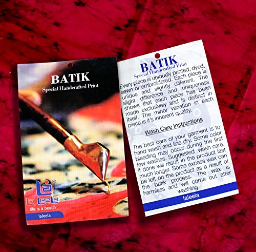 ==> fabric and wash care:- we recommend hand washing your garments in cold water and hanging them on a line to dry. some color bleeding may occur during the first few washes. many customers report that they have no problem Using a Machine Wash on cold and a dryer on permanent press. as you may already know, the best care for your garment is to hand wash and line dry. this way it will last much longer. also be aware that excess wax can be left on the product as a result of the BATIK process. the wax is harmless and will come off after washing.every piece is uniquely sewn, printed, dyed. each piece is unique and slightly different. the slight difference and uniqueness shows that each piece has been made exclusively. thus minor variation in each piece is its inherent quality.