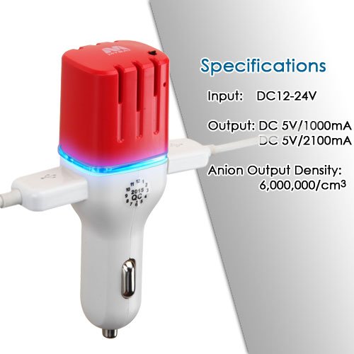 Studio : Cell Accessories For Less (TM) Publisher : Cell Accessories For Less (TM) Binding : Wireless Phone Accessory Product Description Cell Accessories For Less (TM) Specifications:Max Output Current: 3.1AInput Voltage Range: 12V-24VAnion Output Density: 6,000,000 / cm3 Description:Generates anion (negative ion) which purifies the air within the car, keeping it fresh and clean.Inhibits bacterial growth by eliminating smoke/pet odors and detoxifies the air of harmful pollutions.Rapidly clears the air which relieves fatigue driving and prevents the spread of viruses.Dual USB ports allow you to charge multiple wireless devices at the same time.Built-in LED light indicates power status Instructions:Plug the Anion Car Charger with Air Purifier into the cigarette lighter socket. The blue LED will light up, indicating the car charger and air purifier has power and is connected properly. To use the car charger with any USB device, insert a cable into one of the available USB sockets; plug your device into the other end of the cable to begin receiving power.Unplug the cable from the anion car charger after the device has been fully charged. To power off the car charger and air purifier, simply unplug the car charger from the cigarette lighter socket. The blue LED will turn off.Cell phones and accessories have become one of the most crucial personal technology purchases. If you don't know which cell phone, iPhone case, or Bluetooth headset to buy, we are here to help. The Target Buys is the perfect one-stop shop for a cell phones, cases, cell phone chargers, cell phone batteries and other accessories. You can choose a smartphone from brands like Samsung, Apple, Amazon Fire, LG, Blackberry, Motorola, Nokia, HTC, Kyocera, ASUS, ZTE, Blu, Sony, Pantech, and Casio. In accessories you have the option to choose from brands like OtterBox, Jawbone, Speck, iOttie, Jabra, Jaybird, and Plantronics. With The Target Buyst you're sure to end up with great accessories. You also have the choice of selecting accessories made for major providers like ATT, Verizon, Sprint, T-Mobile, Virgin Mobile, Boost Mobile, MetroPCS, Net1 0