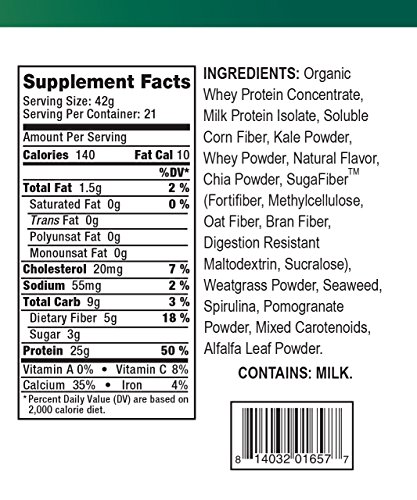 -. Feature : 25 grams whey and multi-plant based protein blend. / 140 Calories, 3g sugar and 5g fiber per serving. / Organic whey protein and greens blend with ingredients like kale, chia, pomegranate, wheatgrass, seaweed and spirulina. / No artificial colors. / Gluten Free and no preservatives.