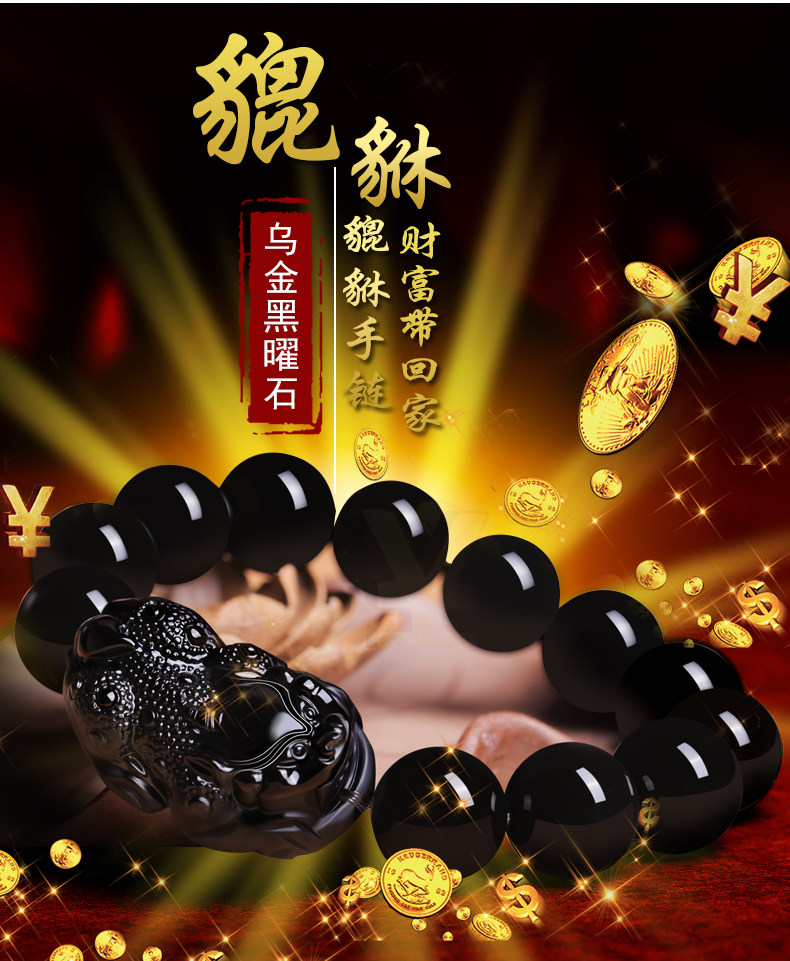 精雕大气纯黑乌金黑曜石貔貅手链男士款招财转运开光佛珠手串正品