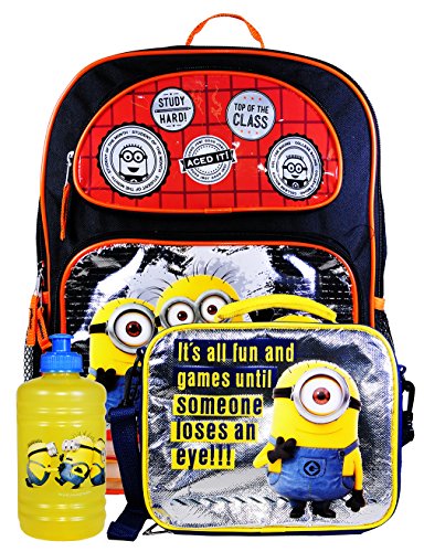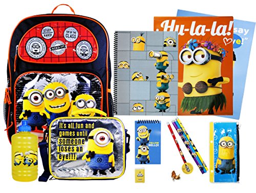 -. Feature : Boys School 16" Inch Backpack with Lunch Bag and Value packs / (1) 11 pcs Back to school stationary set (4 Pencil , Spiral Notebook, Memo pad , Pencil Pouch , 2 Paper Folders , Eraser , Sharpener) / (1) 16" Inch Backpack -Approx Dimensions: 16in (40.5cm) tall, 12in (30.5cm) wide, and 5in (12.5cm) deep / (1) Lunch Bag with Strap ,Comes with 16 oz Water Jug / (1) Sticker Set +Non Woven tote Bag (Not included with Minions product!!)