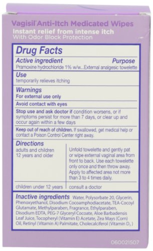 ReleaseDate : 2015-06-22 Studio : Vagisil Publisher : Vagisil Binding : Health and Beauty Product Description Relieves intense, burning itch fast. Wipes away irritating discharge. Soothes skin with vitamins. 1% Pramoxine hydrochloride. 5 x 6 Inch wipes. Feminine itching can sometimes be accompanied by odor. Only Vagisil Anti-Itch Medicated Wipes have Odor-Blockin 0