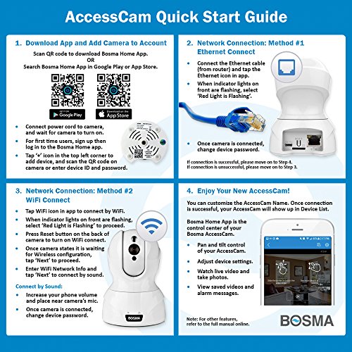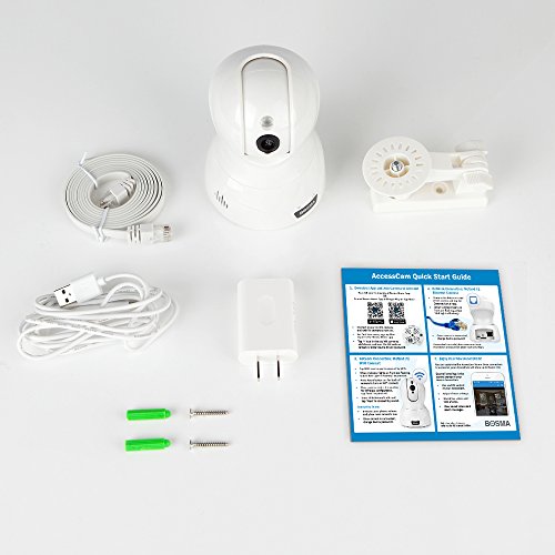 -. Feature : HOLIDAY SALES P.R.ICE!!! STUNNING RESOLUTION & WIDE FIELD OF VIEW: Bosma AccessCam provides complete surveillance with 1080P HD resolution and a 110° field of view! Control the 350° horizontal and 105° vertical pan and tilt remotely! / VERSATILE MOUNTING: Allows for easy and flexible placement of the AccessCam on horizontal and vertical surfaces. / TWO-WAY AUDIO: Monitor and communicate with loved ones and pets using your AccessCam with the built-in mic and speaker. / REAL TIME ALERTS WITH MOTION DETECTION AND NIGHT VISION: Monitor your home day and night using night vision and motion detection for complete surveillance. Receive notifications on your mobile devices anytime, anywhere! / MULTIPLE STORAGE OPTIONS: Bosma AccessCam supports up to a 64GB Micro SD card. Additional 1TB storage is available with the Bosma BaseBox.
