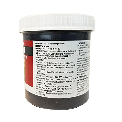 -. Binding : Kitchen -. Brand : Stone Pro -. EAN : 0647627272825 -. Feature : Surfaces: Granite / Enhances color and adds shine to dull granite / Adds final luster to polished granite / Minimizes light surface scratches / Coverage: 200-400 sq. ft. per pound. -. IsAutographed : 0 -. IsMemorabilia : 0 -. Label : Stone Pro -. Manufacturer : Stone Pro -. Model : AX-AY-ABHI-73440 -. MPN : P-GPD1 -. NumberOfItems : 1 -. PackageQuantity : 1 -. PartNumber : P-GPD1 -. ProductGroup : Home -. ProductTypeName : HOME -. Publisher : Stone Pro -. Studio : Stone Pro -. Title : Stone Pro Pro Shine - Granite Polishing Powder - 1 Pound - Dark -. UPC : 647627272825