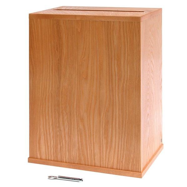 A4判用紙や角2封筒を折り曲げずに投入できます。 製造国:日本 素材・材質:木製(MDF)・木地塗 商品サイズ:(約)外径:間口295×奥行202×高さ370mm、投入口:左右250×幅20mm、取出口:幅264×高さ216mm 重量:約3.5kg 仕様:取出し口用鍵2本付 ※サプライヤー直送品 ご注文後3~4営業日後の出荷となります【商品名】コレクト 入札箱 大 MDF製 鍵つき M-507