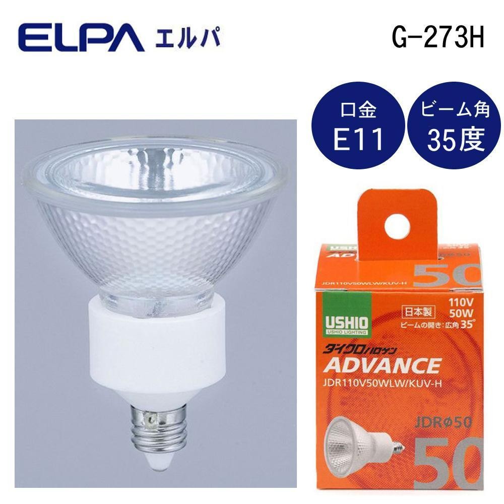 高い発光効率と高品質な光を実現したハロゲン電球です。省電力・UVカットタイプ。 製造国:日本 商品サイズ:全長:62mm、バルブ径:50mm 仕様:口金:E11電圧:110V消費電力:50W寿命:約3000時間ビーム角:広角35度 ※サプライヤー直送品 ご注文後3~4営業日後の出荷となります【商品名】ELPA(エルパ) USHIO(ウシオ) 電球 JDRΦ50 ダイクロハロゲン アドバンス 50W JDR110V50WLW/KUV-H G-273H
