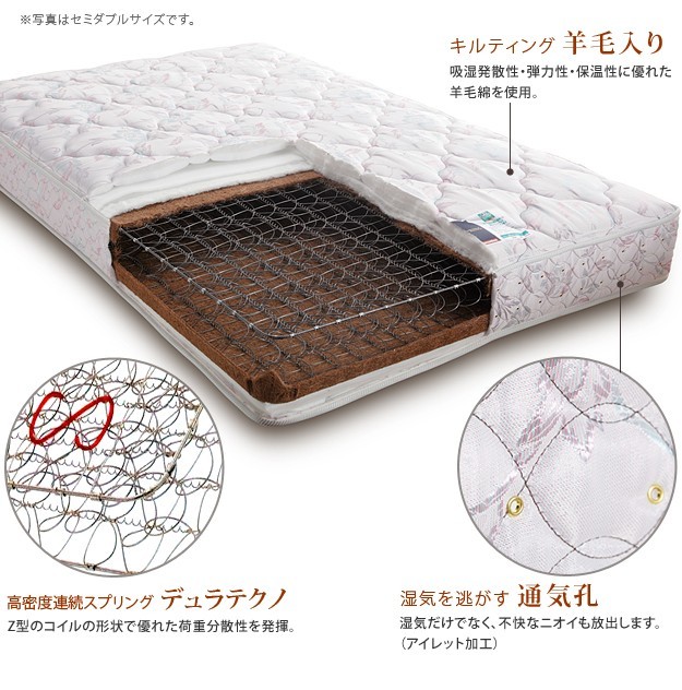 高密度連続スプリングのデュラテクノスプリングマットレス。スプリングの形状を複雑にすることで体を支えるマット面の密度を高めて、優れた体圧分散性を誇ります。詰め物に羊毛綿を入れソフト感を出し、吸湿発散性にも優れます。通気性を考慮したアイレット加工(通気孔)