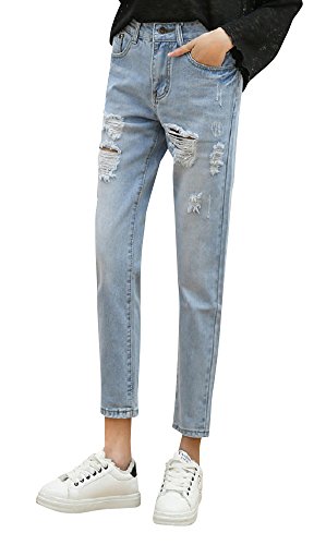 -. Feature : 【サイズは左側の画像から詳細を確認お願いします】今季トレンドのルーズになりすぎず絶妙なボーイズライクなシルエットのクラッシュデニムジーンズです。トップスはシャツやTシャツなんでもGOOD!足元は9部丈で短めなのでヒールやパンプスなどとも相性OK!もちろんスニーカーも相性抜群です。 / ワタリ幅に十分なゆとりを持たせた作りで、窮屈感ゼロの楽ちんな履き心地。大人女子におススメのシンプルデザイン。伸縮性があるので着心地が良く体にフィットします★ / そのまま穿くのはもちろん、ロールアップして足首をチラ見せすれば今季らしい抜け感のあるきれいめな装いのデニムパンツです。春夏秋冬と年中関係なく使えるシンプルでベーシックなデザインは気回し力も抜群★ / 定番ながら、季節感や年齢も関係なし、ワードローブには欠かせないヘビロテのダメージジーンズアイテムです。ダークブルーとライトブルーの2色展開でまとめ買いもおすすめ★気分に合わせて使い分けも楽しいファッションアイテムです。 / ゆったりとした大きめサイズからフィット感のあるサイズまでバリエーション豊富です!詳しいサイズは画像で掲載しています。【サイズ】26・27・28・29・30【カラー】ダークグレー・ライトブルー