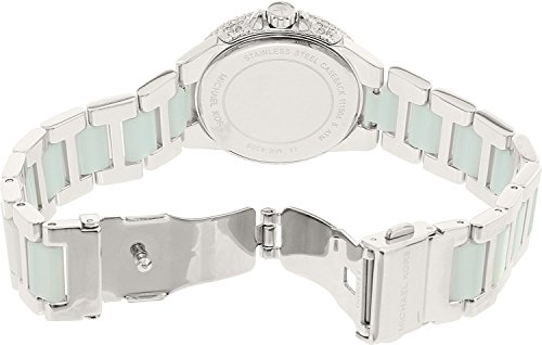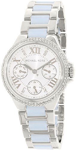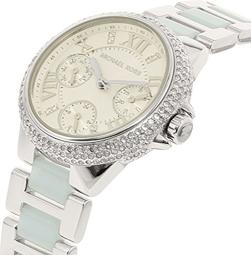 Two-tone stainless steel case and bracelet with a scintillating rhinestone bezel. Three-hand analog display. Sub-dials display day, date, and 24 hour military time. Fold-over clasp closure. Water resistant 50 meters/165 feet. Imported.