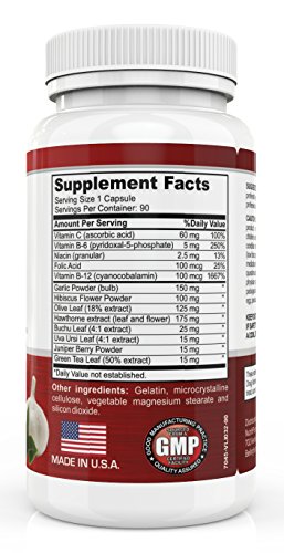 NutritiPure Advanced Blood Pressure Support Formula contains: Vitamin C, Vitamin B-6, Niacin, Folic Acid, Vitamin B-12, Garlic Powder, Hibiscus Flower Powder, Olive Leaf, Hawthorne Extract, Buchu Leaf, UvaUrsi Leaf, Juniper Berry Powder and Green Tea Leaf