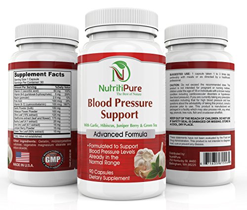 NutritiPure Advanced Blood Pressure Support Formula is made from a combination of top quality natural herbs, extracts and vitamins that help support blood pressure levels and promote healthy blood circulation. The best results are obtained when 1 to 3 capsules are taken daily and when combined with an active lifestyle. NutritiPure Blood Pressure Supplement is made in the USA and undergoes stringent quality controls in a FDA-approved, GMP certified facility. Each bottle contains 90-capsules and will last 30-90 days if the daily recommended intake is followed. We offer a SATISFACTION GUARANTEE so you can try our product risk free!