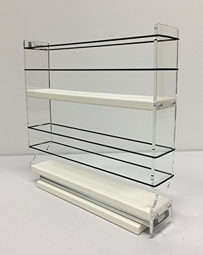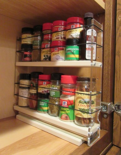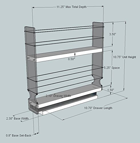 -. Feature : Patented Design - Holds and Organizes 12 regular or 24 half sized spice jars in a small space, bringing the back row easily to the front for you. / SIZE: 11.25" deep x 2.25" wide x 10.75" tall. DEPTH = back of the cabinet to inside the closed door. WIDTH = between the hinges. HEIGHT = needs 12" tall space for Std spice jars. / Very easy DIY install, a screwdriver is the only tool. Arrives assembled with mounting screws. Flexible side bands, full extension ball-bearing slides and clear panels for great access to all containers. / The 2.05" wide x 10.7" long drawer rides on a steel ball-bearing slide. The fronts and backs are clear acrylic (Plexiglas). The drawers and base are PolyTuf HDPE for long life and easy clean-up. Each band is a polyester fiber surrounding the elastic core (ponytail tie). / Combine with other Vertical Spice products for your custom cabinet storage solution. Measure carefully, we have many sizes (WIDTHS, HEIGHTS and DEPTHS) made to sit side-by-side.