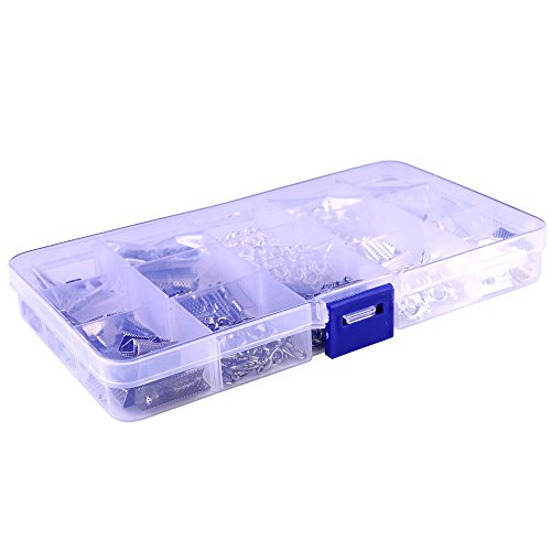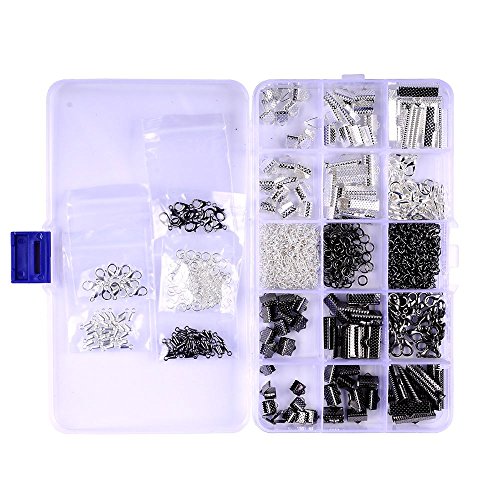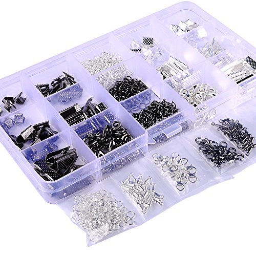 A BOX 2 COLOR 5 SIZE Ribbon Bracelet Bookmark Pinch Crimp Clamp End Findings Cord Ends Leather Crimp Ends Drop End Open Jump Rings Lobster Claw Clasps Jewelry Making Findings (BLACK & SILVER)