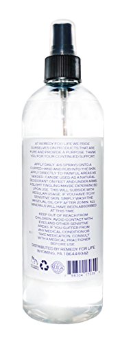 -. Binding : Health and Beauty -. Brand : REMEDY FOR LIFE -. Color : Clear -. EAN : 0798304170399 -. Feature : SUPPORTS A HEALTHY IMMUNE SYSTEM / MIGRAINE RELIEF / PAIN AND SORE MUSCLE RELIEF / IMPROVES BODY PH LEVEL / PROMOTES RELAXATION AND MELATONIN PRODUCTION -. IsAdultProduct : 0 -. Label : REMEDY FOR LIFE -. LegalDisclaimer : If you suffer from any medical condition or take medication, consult with a medical practitioner before use. -. Manufacturer : REMEDY FOR LIFE -. MPN : RFLMO16 -. PackageQuantity : 1 -. PartNumber : RFLMO16 -. ProductGroup : Health and Beauty -. ProductTypeName : HEALTH_PERSONAL_CARE -. Publisher : REMEDY FOR LIFE -. Size : 16 oz. -. Studio : REMEDY FOR LIFE -. Title : Transdermal Magnesium Oil Spray BIG 16 FL OZ Highly Concentrated 100% Natural Magnesium -. UPC : 798304170399