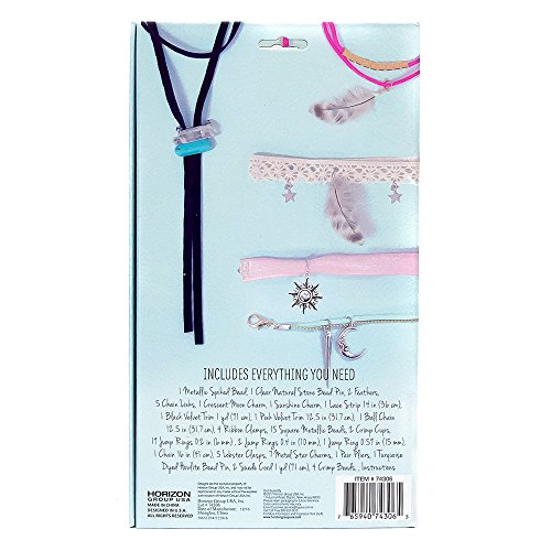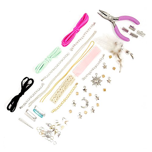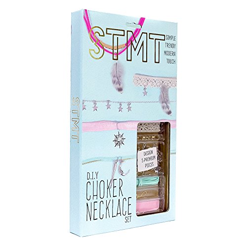 The STMT D.I.Y. Choker necklace set is the perfect gift for the aspiring jewelry designer! explore and learn different jewelry techniques with the easy-to-follow instruction booklet or create your own unique pieces. Make a trendy boho choker with feathers and lace or make a rocker chic choker with chains, spikes and velvet; the carefully curated charms and embellishments cater to all styles and trends! this jewelry set includes everything you need to get started. Kit includes: 1 metallic spiked ball – 1 clear natural stone bead pin – 2 feathers – 5 chain links – 1 crescent Moon charm – 1 sunshine charm – 14 in. Lace strip – 1 Yd. Black velvet trim -- 12.5 in. Pink velvet trim – 12.5 in. Ball chain – 4 ribbon clamps – 15 metallic square beads – 2 crimp clips – 19 – 0.2 in. Jump rings – 2 – 0.4 in. Jump rings – 0.59 in. Jump ring – 16 in. Chain – 5 Lobster clasps – 7 metal Star charms – mini pliers – 1 turquoise dyed how lite bead pin – 2 – 1 Yd. Suede cords – 4 crimp beads – an instruction booklet.Feature