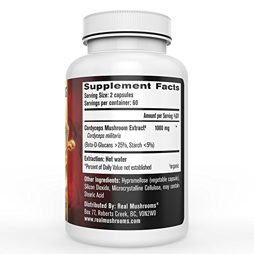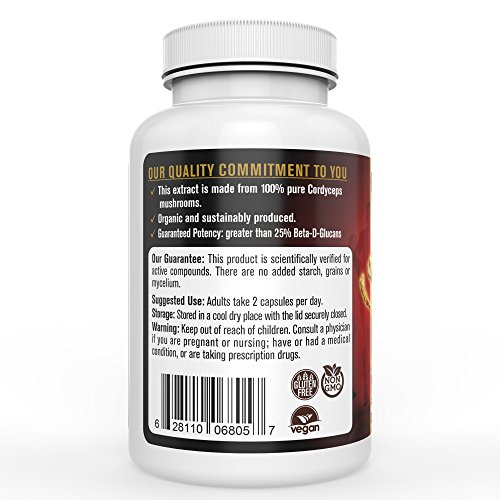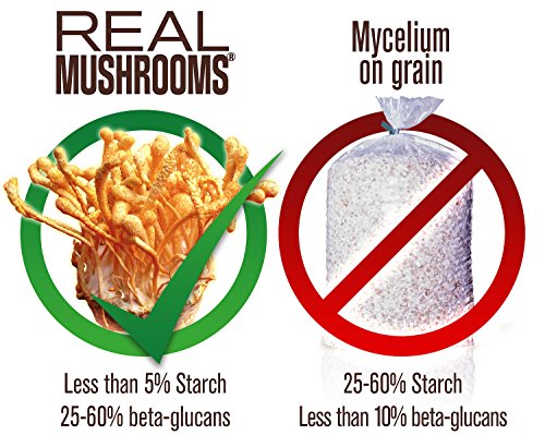 -. Feature : CORDYCEPS MUSHROOM EXTRACT POWDER: Made exclusively from 100% organic cordyceps militaris mushrooms. The fruiting bodies are cultivated which ensures the best extract possible. The mushrooms undergo a hot water extraction to obtain the beneficial beta-glucan and cordycepin compounds, plus thousands of other nutrients from the mushrooms. We do not add any mycelium, starch, grains, or fillers into our products. Just 100% pure mushrooms. / SHAKES | SMOOTHIES | COFFEE | TEA: Real Mushrooms Cordyceps-M arrives in an easy-to-use airtight, resealable health grade packaging allowing for as much or as little use as you need for any occasion. For an extra health boost, add it into your coffee, tea, green smoothies, post-workout protein shakes, as an extra ingredient in your favorite recipes or maybe even an upgrade in your bulletproof coffee. Our extracts are 80-90% soluble in water. / GUARANTEED POTENCY: Real Mushrooms Cordyceps-M is guaranteed by analytical testing to have the active, medicinal compounds scientifically shown to boost your immune system. Our extract contains >25% Beta-glucans, >0.3% cordycepin and <3% Starch. Beta-glucans are the main active, most well researched, medicinal compound in mushrooms. We measure beta-glucans specifically because polysaccharides numbers include starch, so polysaccharide testing can yield a false sense of quality. / 100% MUSHROOM: Unlike Cordyceps sinensis, which is unable to produce a fruiting body, our Cordyceps-M is made from 100% Cordyceps militaris fruiting bodies. Our product undergoes rigorous quality control testing to make them Certified Organic, Certified Kosher, Gluten-Free, Non-GMO, Vegan, Dairy-Free and Nut-Free. We guarantee that there is absolutely no added mycelium, starch, grains, contaminants or fillers of any kind. Just 100% pure mushrooms. / 100% SATISFACTION GUARANTEED: If for some reason, you are not satisfied with our mushroom extract powders we provide a no-hassle no-questions-asked refund. Yes, we are that devoted to your happiness!