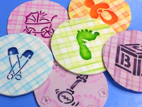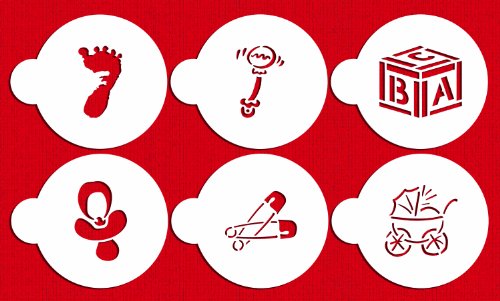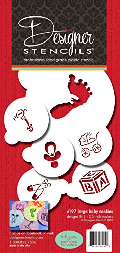 Designer Stencils C197 Baby Cookie and Cupcake Stencils (Large), Baby Carriage - Rattel - Pacifier - Block - Diaper Pins - Footprint, Beige/semi-transparent