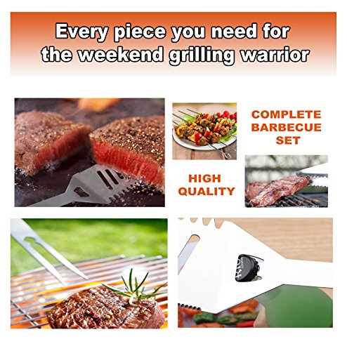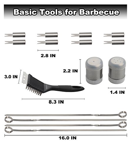 COMPLETE BARBECUE SET: Great set for the grilling fanatic covering all that you need to get right into grilling, set includes 4-in-1 spatula, fork, superior-grip tongs, silicone basting brush, 4 kabob skewers, 8 corn holders, salt&pepper shaker, aluminum storage case, grill cleaning brush, grill apron.