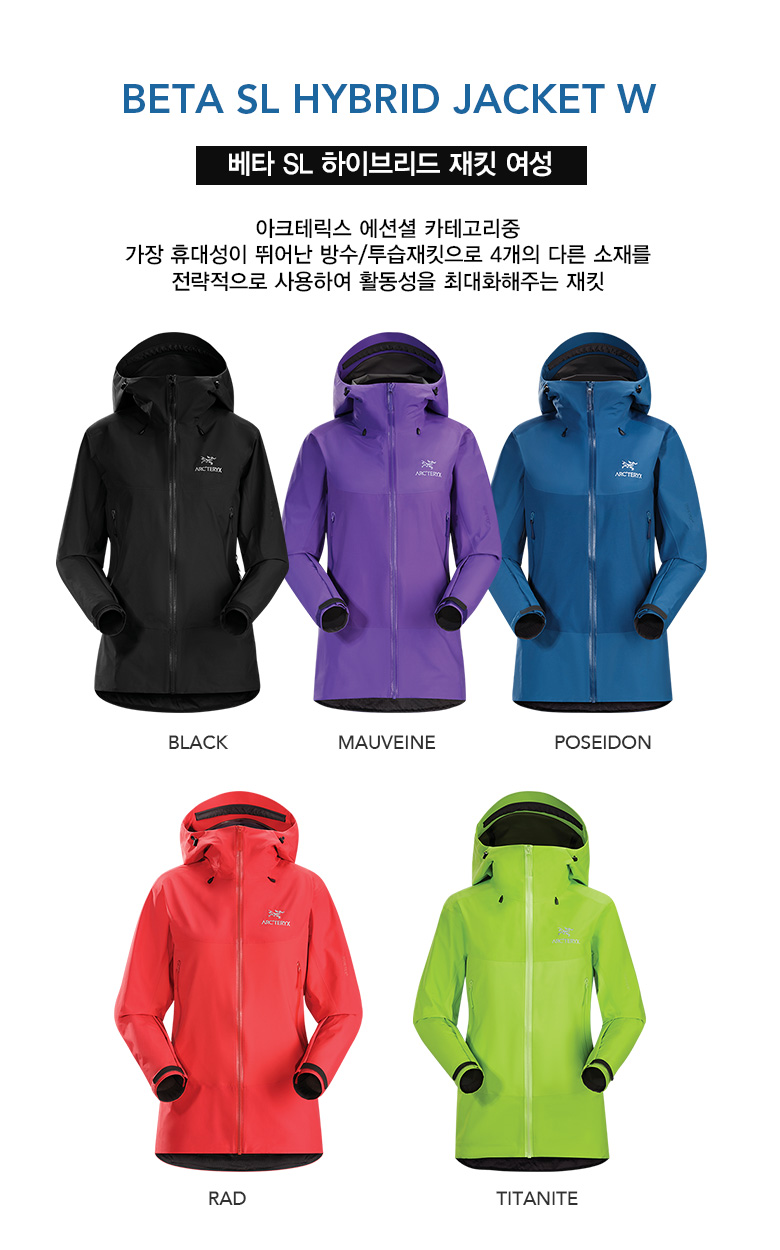 아크테릭스 에션셜 카테고리중 가장 휴대성이 뛰어난 방수/투습재킷으로 2개의 다른 소재를 전략적으로 사용하여 활동성을 최대화해주는 재킷