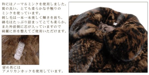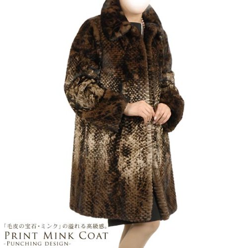 -. Feature : 【モデル】身長163cm 【素材】ミンク 【留め具】カギホック×1、アメリカンホック×3 【重量】1780g 【備考】上質の証[KOPENHAGEN FUR GOLD LABEL]最高級品質のミンクを使用。 / ミンク / ■サイズ 着丈、胸周り、肩幅、袖丈(cm) 90/100/44/63 / 華やかな雰囲気のプリントミンクコート。 美しい輝きを放つ、「毛皮の宝石」ミンクにプリントとパンチングデザインを施した華やかな雰囲気のコートです。 パンチングデザインにより通常の毛皮よりも軽く仕上がっております。 襟はノーマルミンクで質の良い柔らかな手触りのミンクを使用。身頃と同じくプリントで統一感を。 襟前部分に芯が入っており綺麗に形を整えてご使用いただけます。