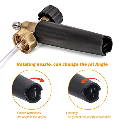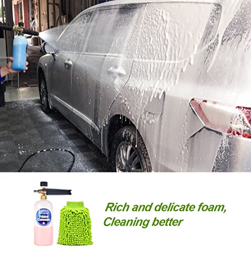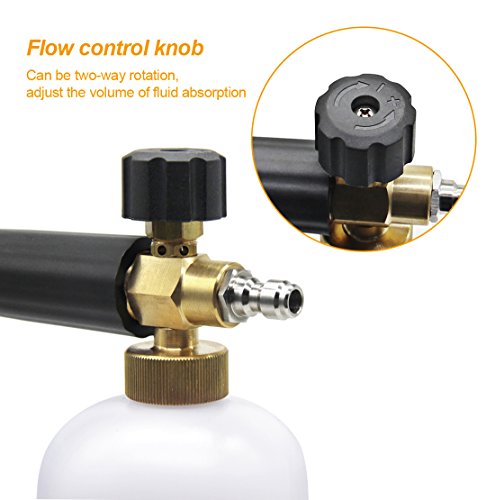 -. Feature : Cleaning better: The foam was thick and delicate and the stains can be rinsed away easily after allowing the foam on the vehicle for just a few short minutes. The Pressure Washer is required to have 2.0GPM & over 1000 PSI Pressure for use. / Durable: Connectors are made of premium brass. The bottle is made of high-quality material, very thick and durable, not easy to crack, anticorrosive. The bottle is translucent and you can see the rest of the cleaner. / Adjustable: The flow control knob can adjust the volume of foam output. The jet angle can adjust the shape of the foam output, it adjusts quite easily from a wide fan to a narrow stream. / Adjustable Foam Lance with 1/4" quick disconnection fitting, 33 OZ (1 liter) container bottle. The package comes with free chenille microfiber car wash mitt. / Note: This foam cannon should be used together with the pressure washer (but pressure washer not included).