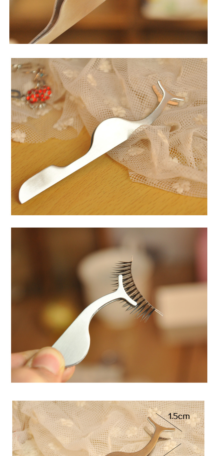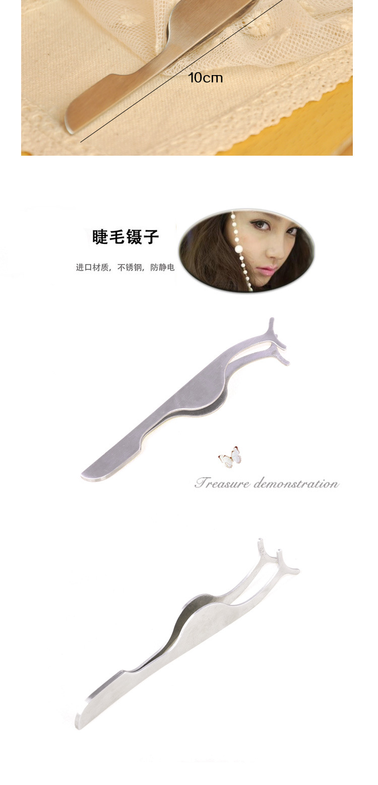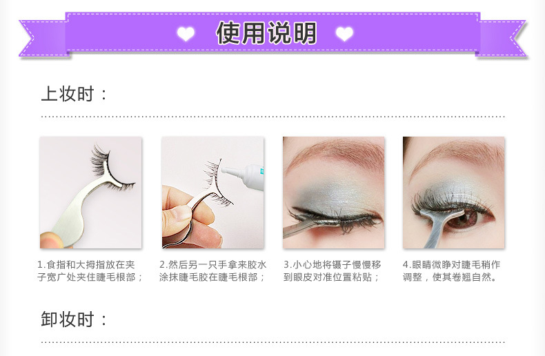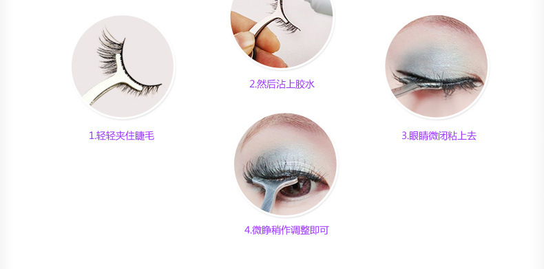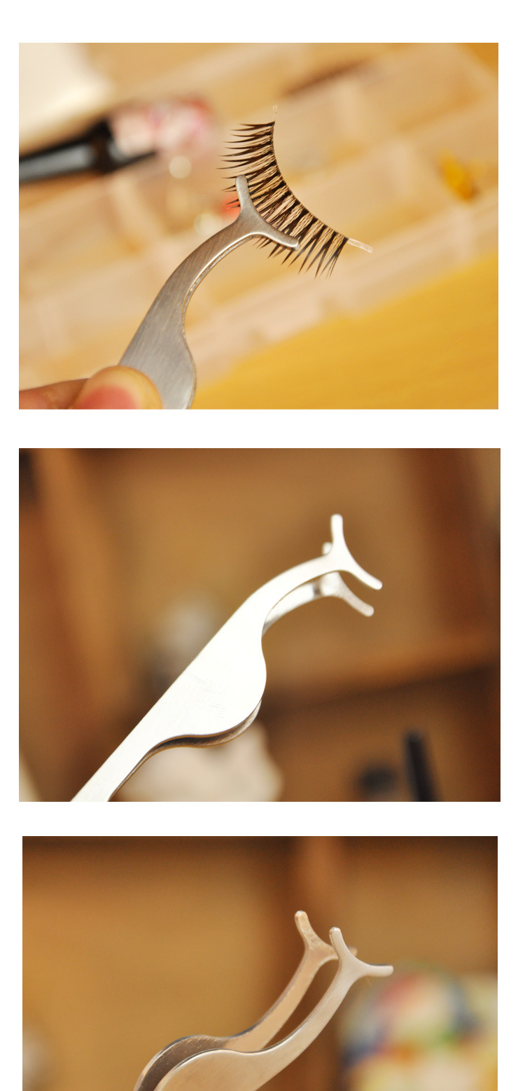 2. The false eyelashes along the tip of the tweezers in the arc, fixed on the clip, and then apply the eyelash glue at the root of the eyelashes