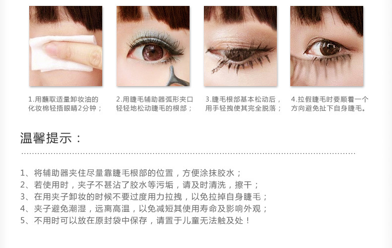 2. Use the corner of the clip to hold the end of the false eyelashes and gently pry open it with your native eyelashes and slowly remove