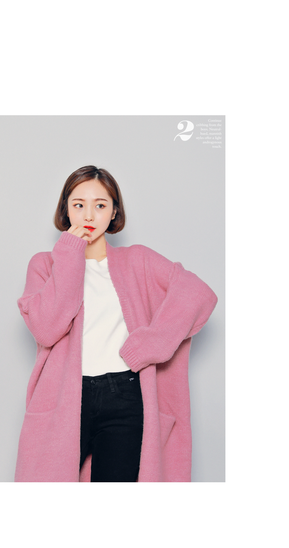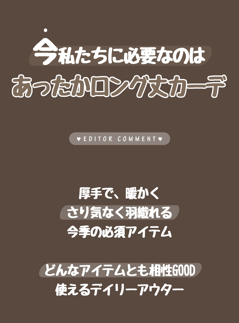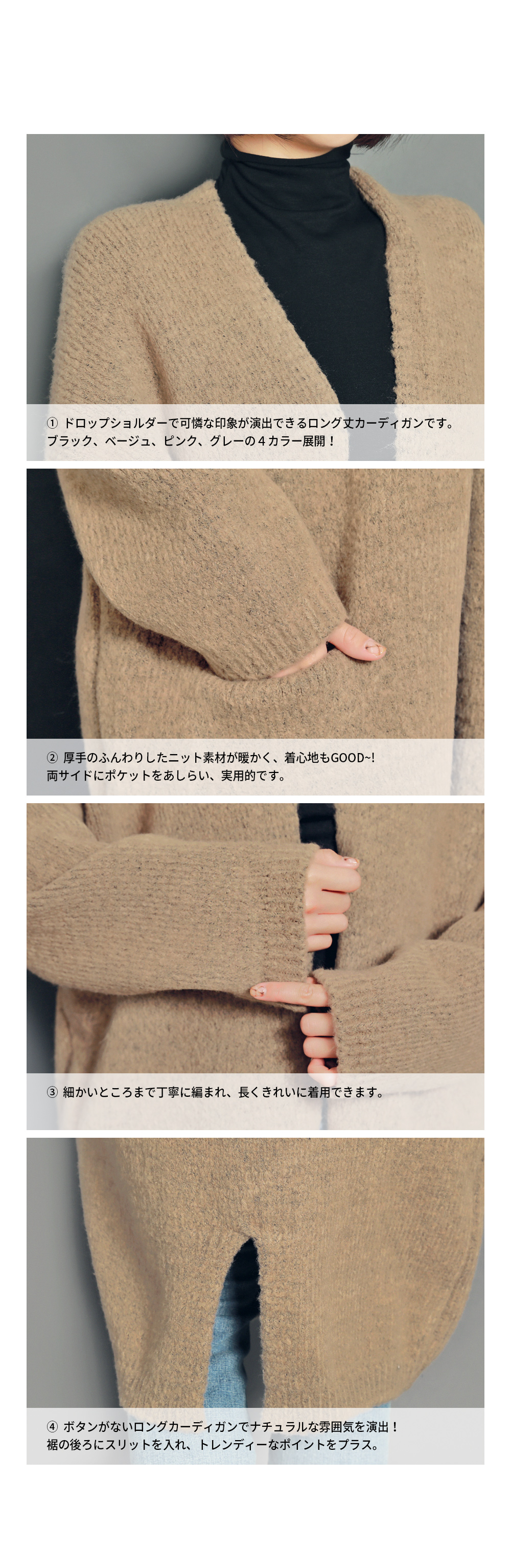 昨シーズンの大人気アイテムが今年もカムバック!ゆる~いフィット感で華奢みえもバッチリ♪ベーシックなブラック、ベージュ、ピンク、グレーの4色展開です。両サイドポケットで実用性も◎厚手の素材感で、肌寒いときでも暖かく着用できます♡ロング丈の裾に入ったスリットがポイント★どんなアイテムとも相性の良いアイテムです。