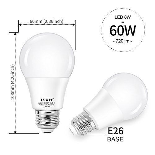 LVWIT A19 LED Bulb 60 Watt Equivalent 5000K Daylight Light Bulb 720 Lumens E26 Bulb Base 8W LED Bulbs Non-dimmable UL-Listed 6-Pack