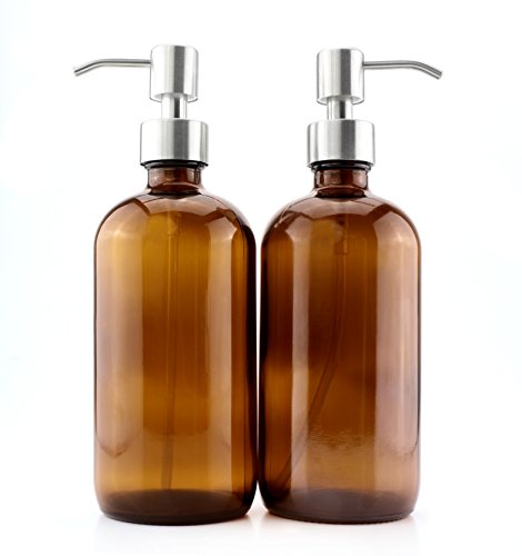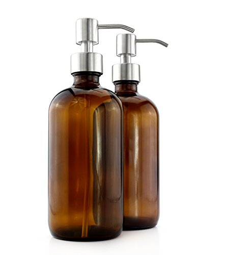 16-Ounce Amber Glass Boston Round Bottles w/ Stainless Steel Pumps (2-Pack); Lotion & Soap Dispenser Brown Bottles for Aromatherapy, DIY, Home & Kitchen