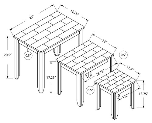 -. Feature : Three piece set includes 3 staggered nesting tables / Sophisticated onyx/cream/grey marble-look table tops with a cappuccino base / Conveniently use as side/end tables and snack tables in any room / Large table: 25"Lx15.75"Dx20.75"H Large Table: 25"Lx15.75 Large Table: 25"Lx15.75"Dx20.75"H / Medium table: 19"Lx14"Dx17"H